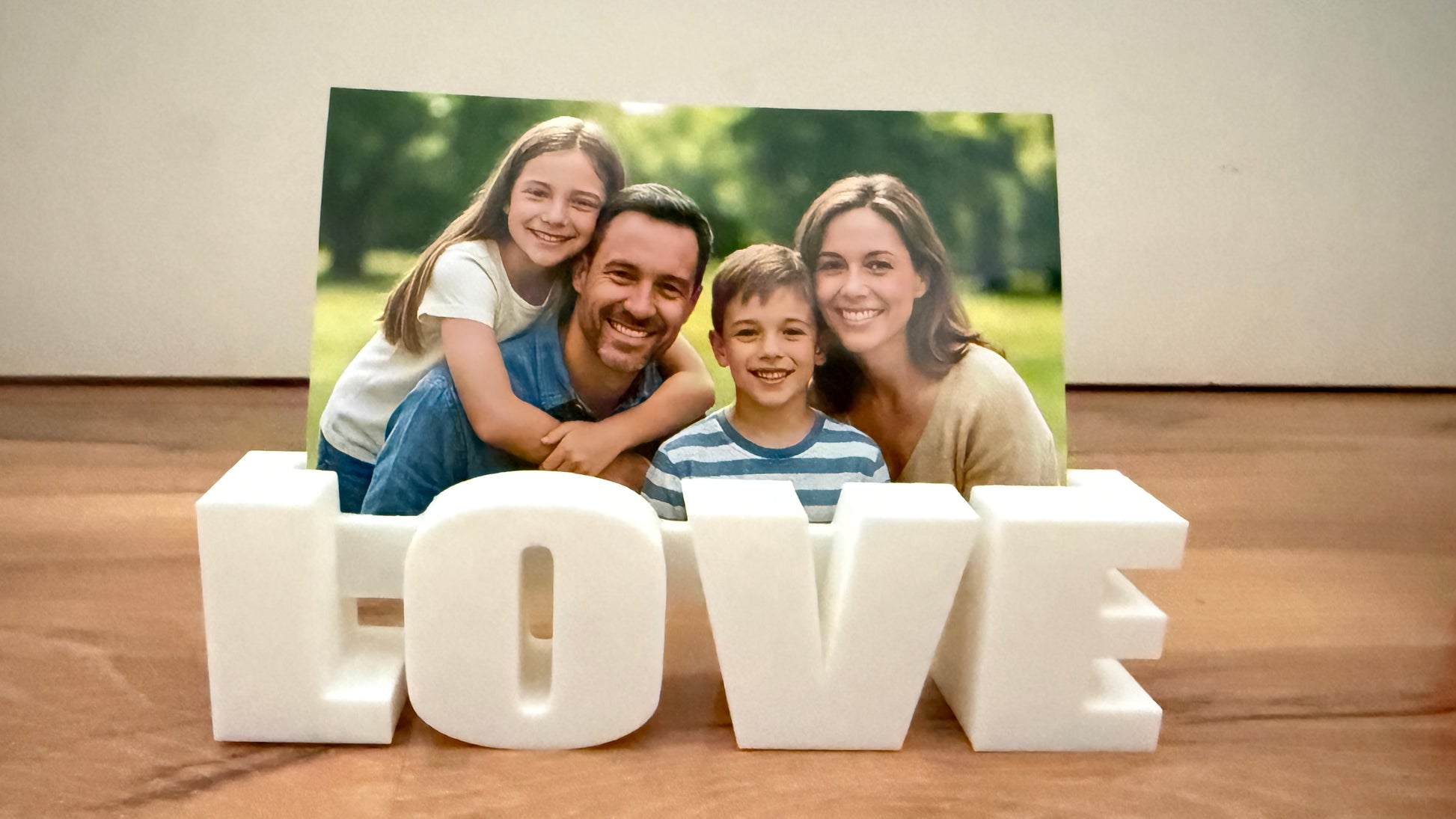 Unser 3D-Fotohalter in Namensform verbindet stilvolle Deko mit persönlicher Note: Der Name wird in stabilen 3D-Buchstaben gedruckt, in die ein kleiner Schlitz für ein Foto, eine Postkarte oder eine Notiz integriert ist.