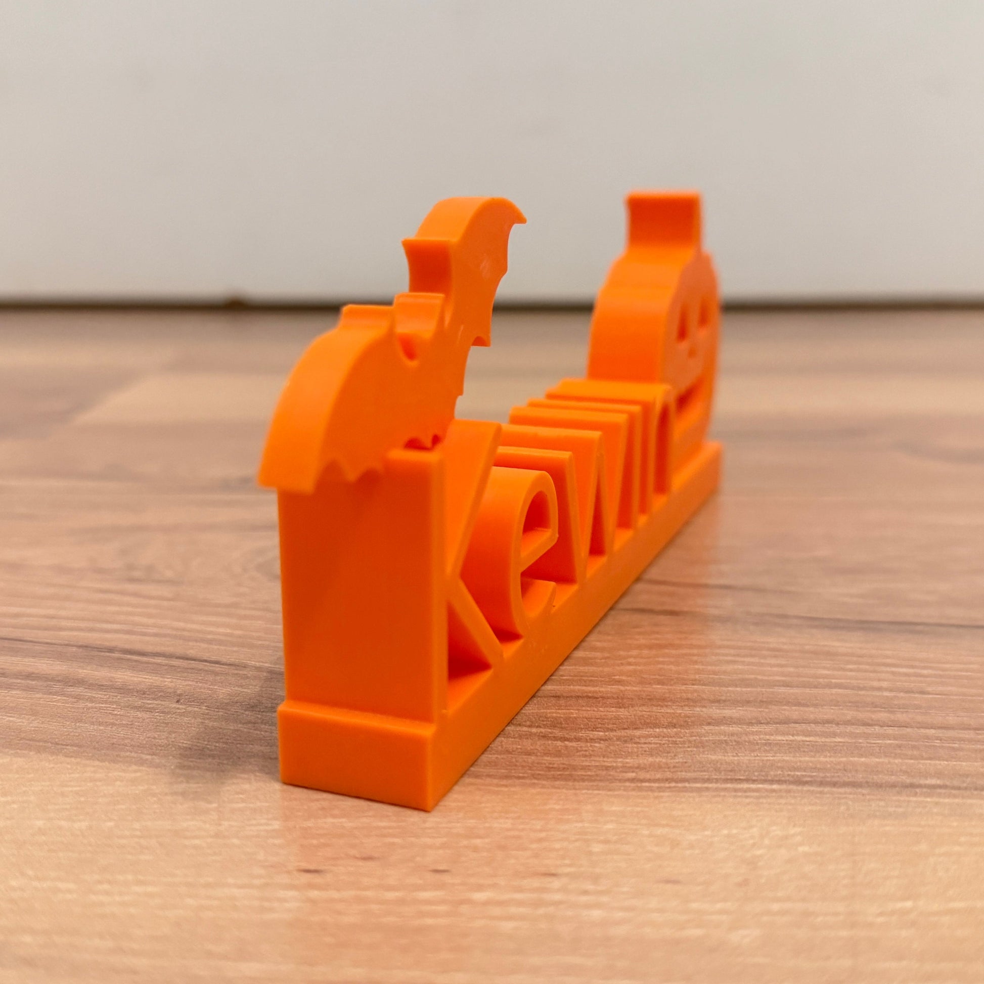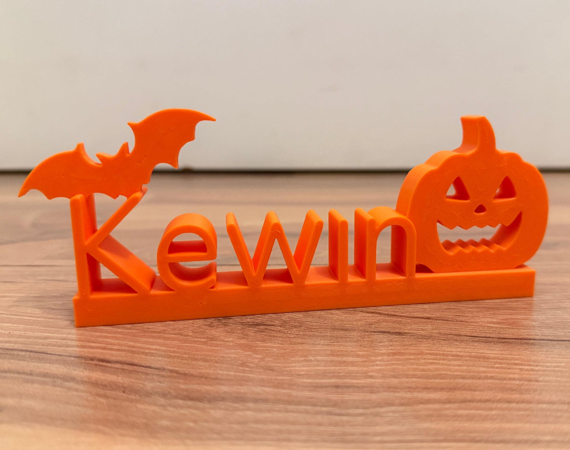 Dieses originelle Namensschild bringt herbstlich-gruselige Stimmung in dein Zuhause! Verziert mit einem lächelnden Kürbis und einer frechen kleinen Fledermaus ist es die perfekte Dekoration für die Haustür, das Kinderzimmer oder den Halloween-Partybereich.