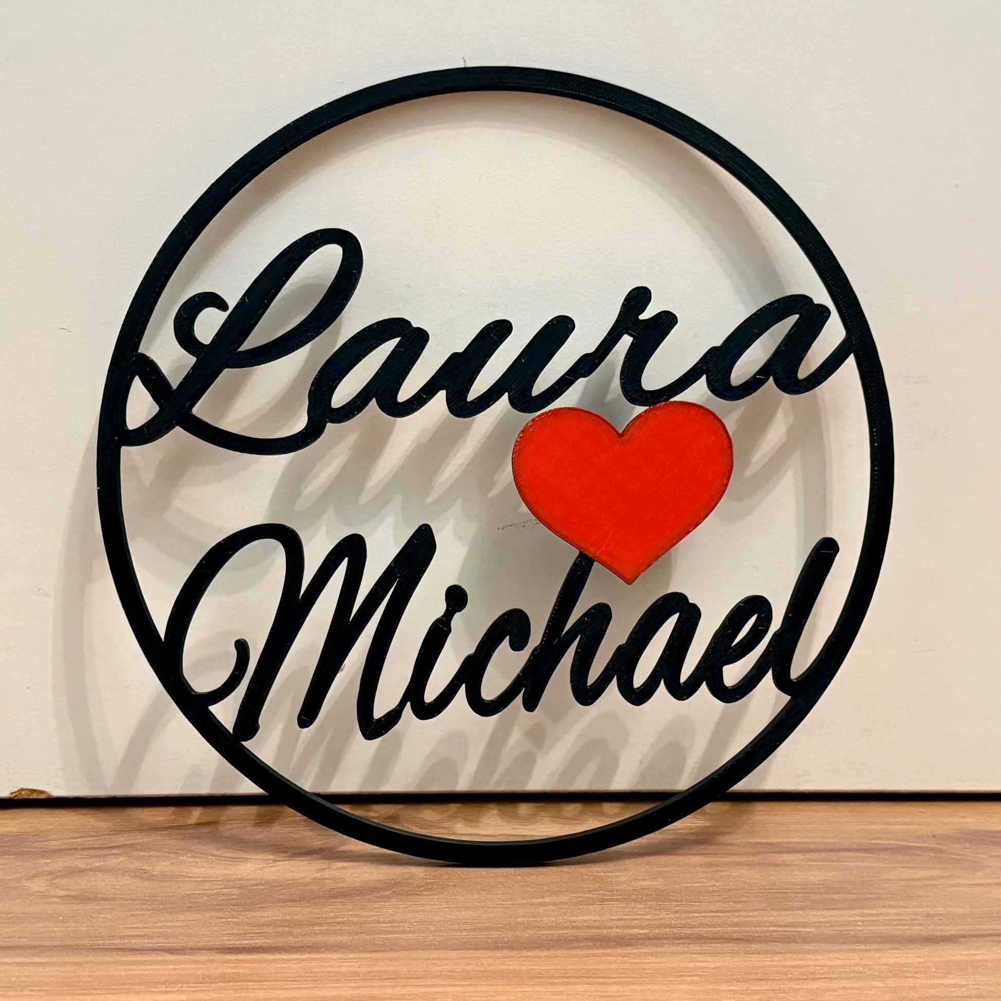 Verleihe deinem Zuhause eine ganz persönliche Note mit unserem eleganten, 3D-gedruckten Türschild im Ringdesign. In einem stilvollen Kreisrahmen stehen zwei Wunschnamen in moderner Schreibschrift, verbunden durch ein liebevolles Herzsymbol – ein echtes Statement für Zusammenhalt und Liebe.