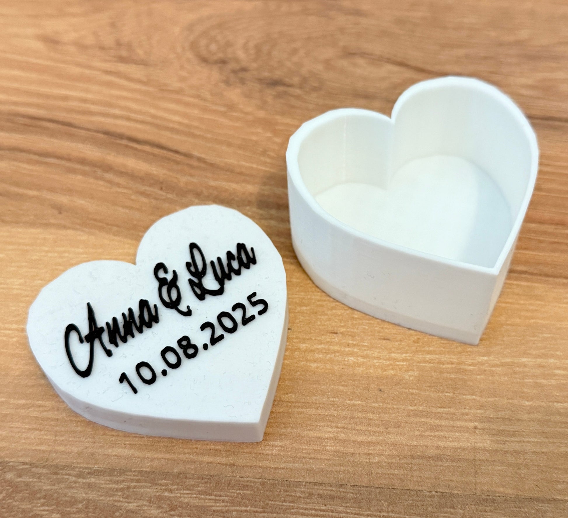 Gefertigt im hochwertigen 3D-Druckverfahren, überzeugt die Box durch ihr elegantes Design, ihre kompakte Form und ihren emotionalen Wert. Ideal für den Antrag, die Trauung oder als besonderes Erinnerungsstück.